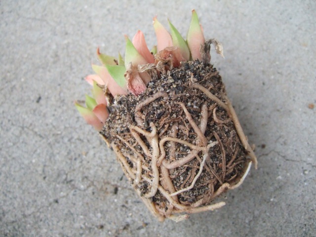 2:鉢の形に根が詰まり、絡みあっている。